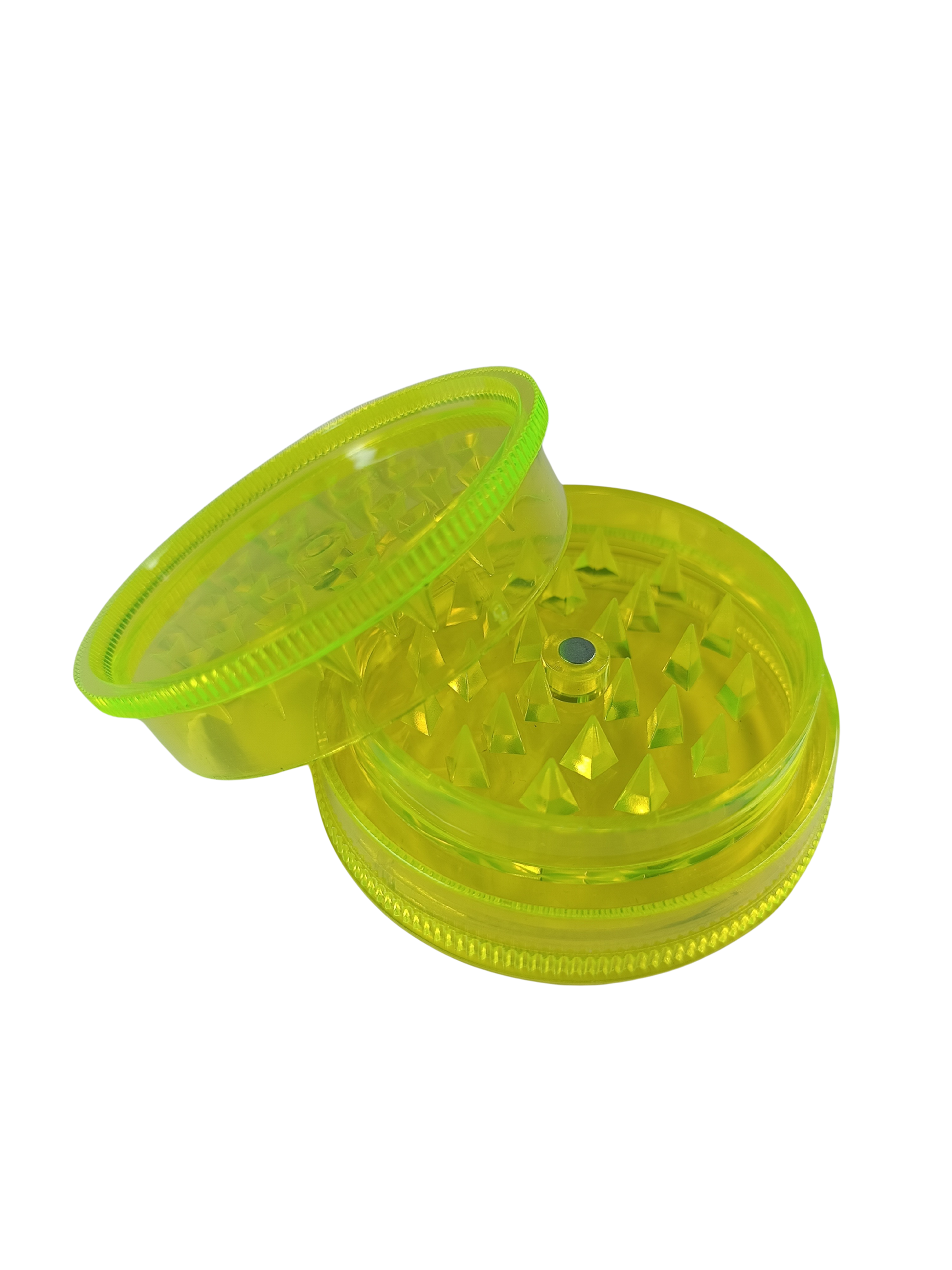 Ce grinder plastique jaune fluorescent est pratique et simple pour broyer et stocker vos herbes, CBD ou cannabis. Son petit compartiment intégré permet un rangement discret et efficace.