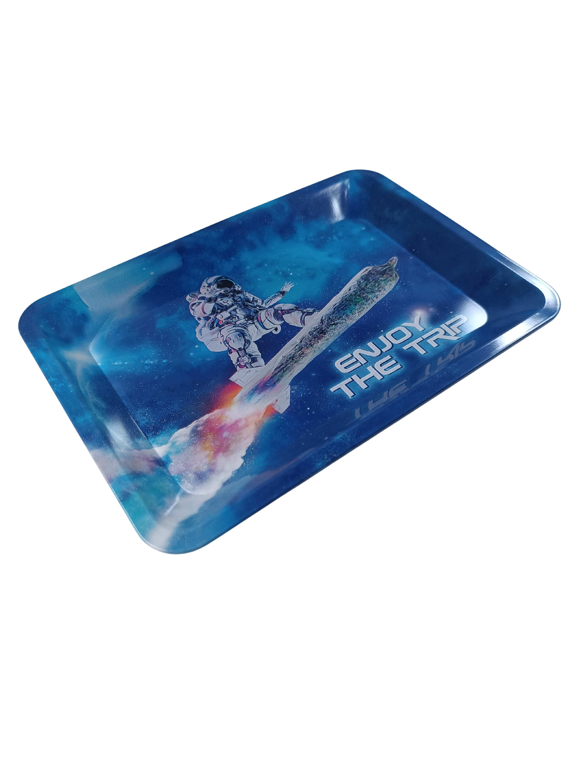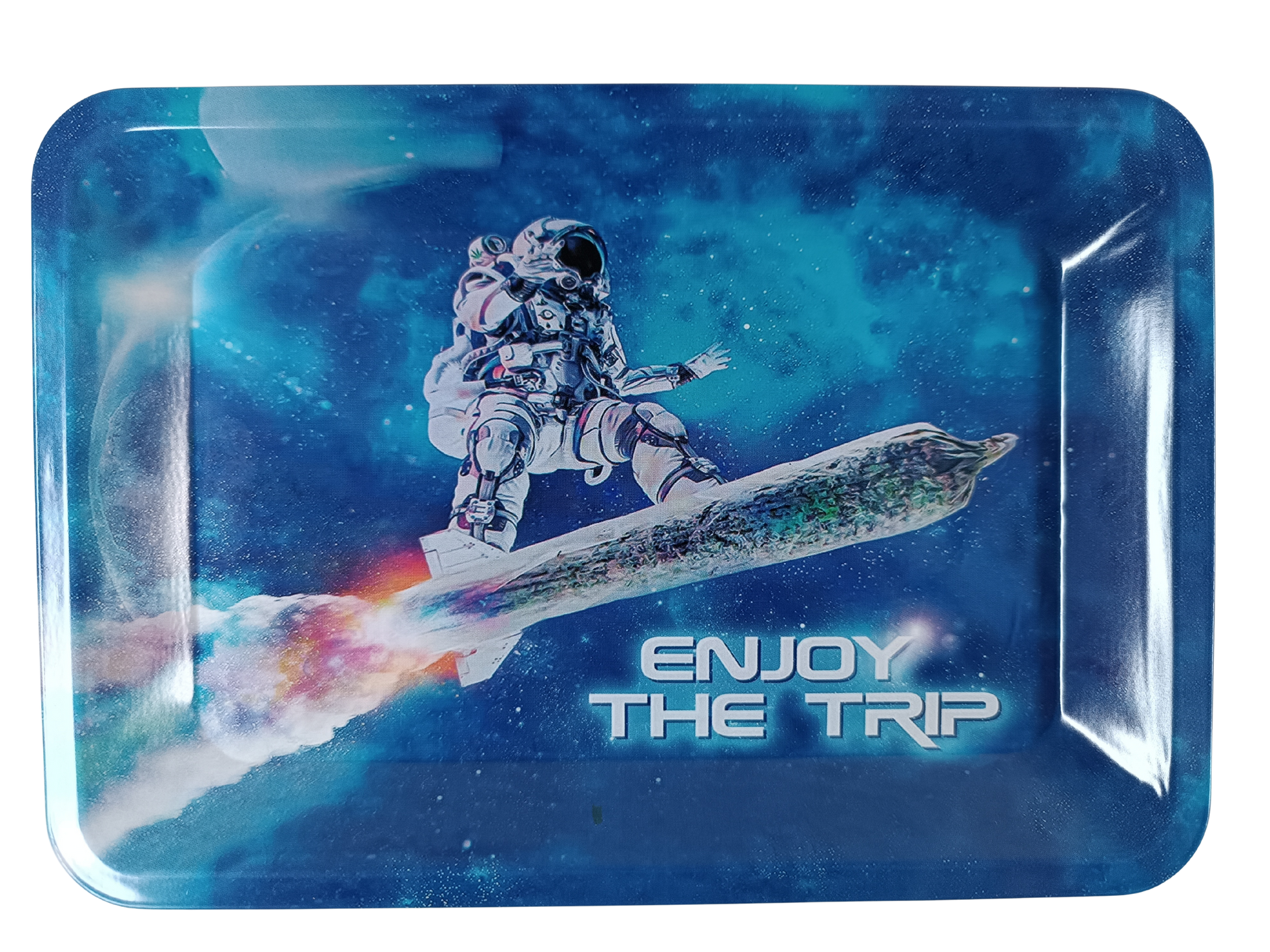 Un plateau à rouler en métal unique, décoré d’un astronaute qui surfe et vole sur un joint géant avec l’inscription Enjoy the Trip. Ce design original mélange univers spatial, humour et culture fumeur, idéal pour ceux qui aiment les accessoires décalés et psychédéliques.