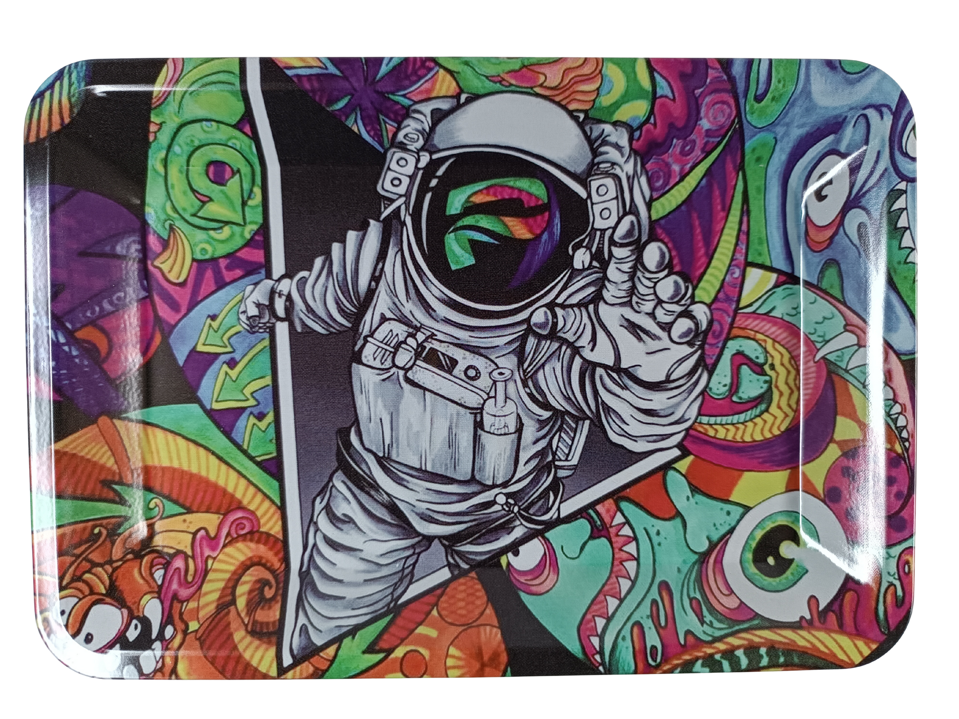 Plateau à rouler en métal au design psychédélique et coloré, mettant en avant un astronaute dans un univers aux couleurs flashy et vives. Un visuel planant qui apporte une touche artistique et psychédélique à vos sessions.