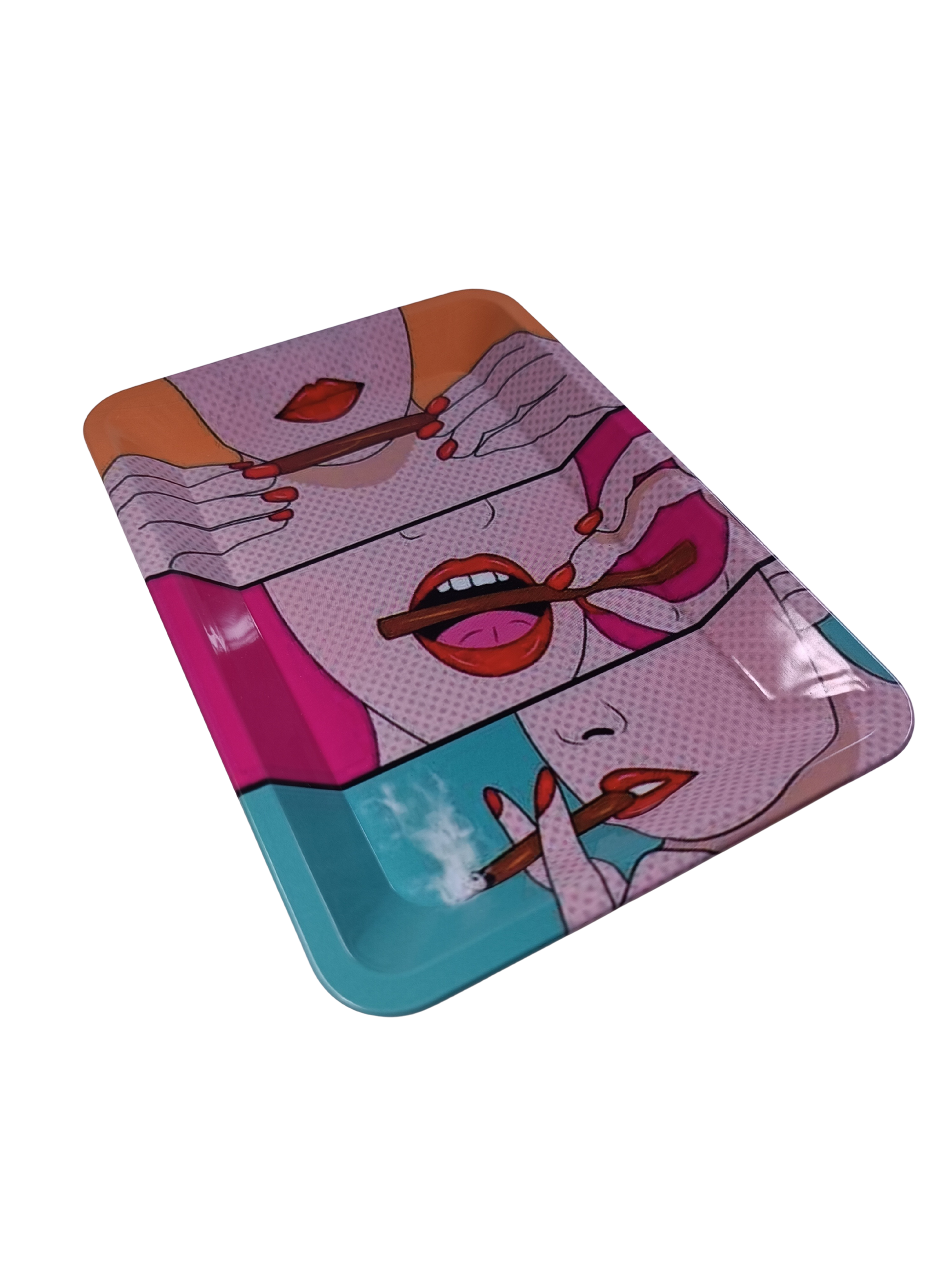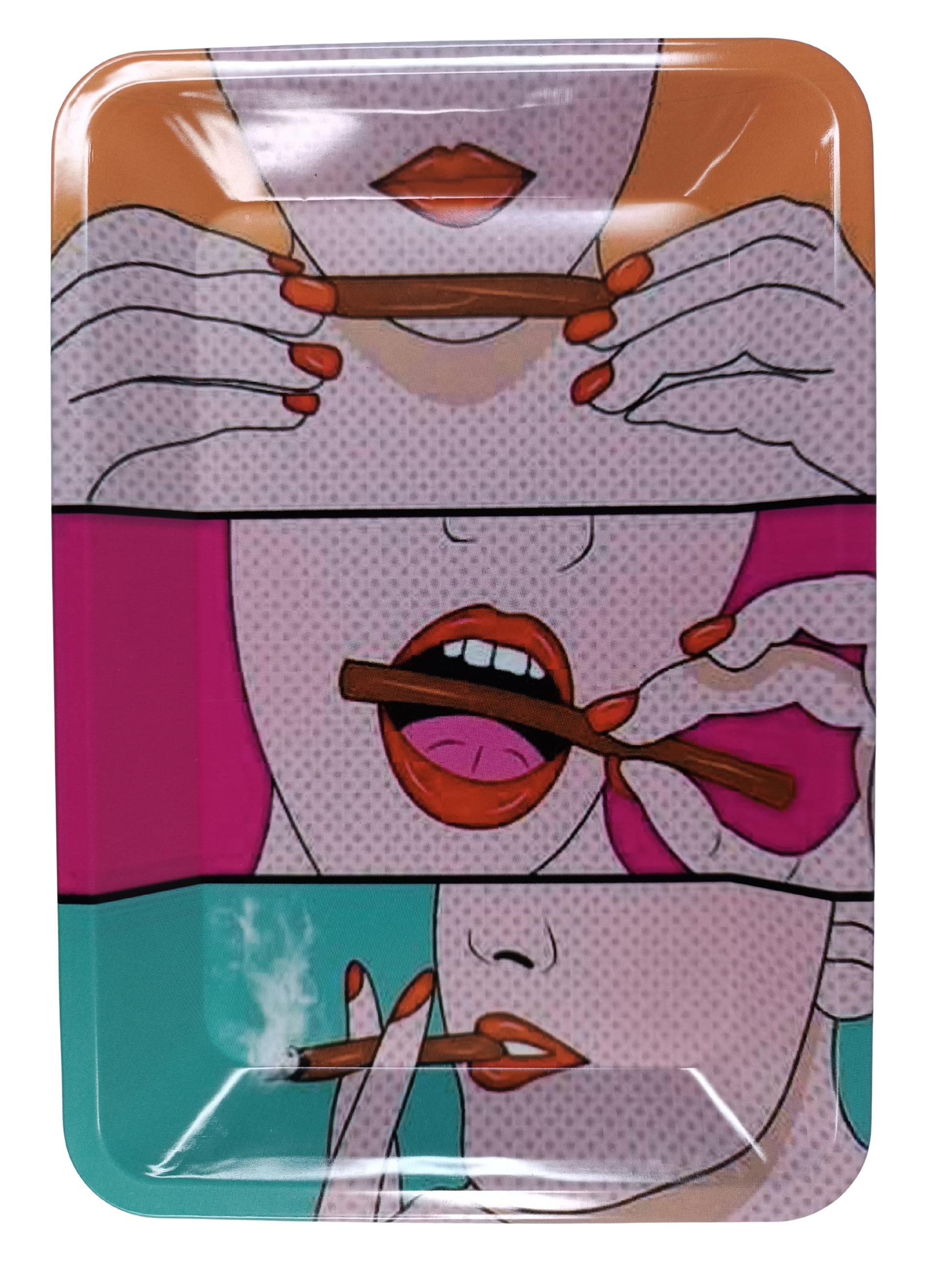 Plateau à rouler en métal au style pop art bande dessinée, représentant une stoner girl qui fume. Ce visuel coloré et décalé est parfait pour ceux qui recherchent des accessoires fumeurs originaux et stylés.